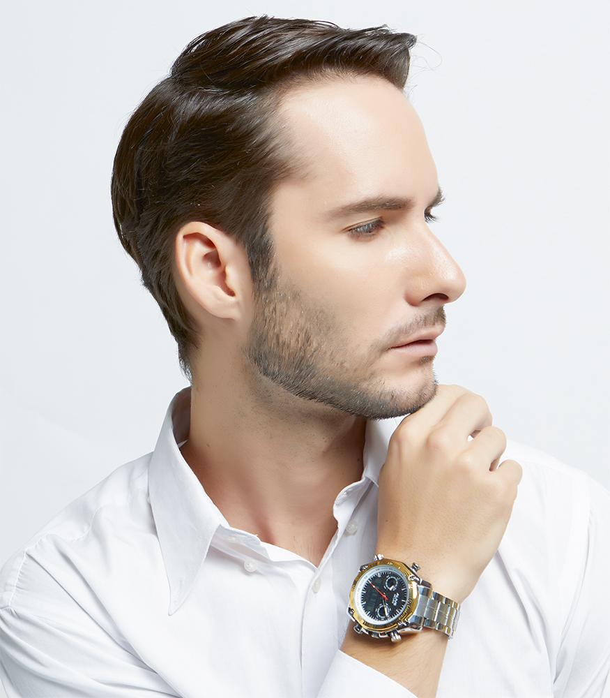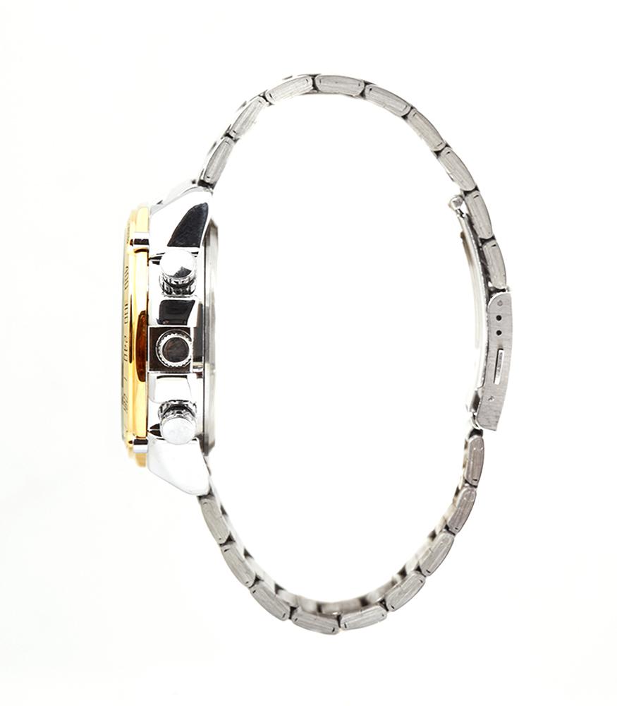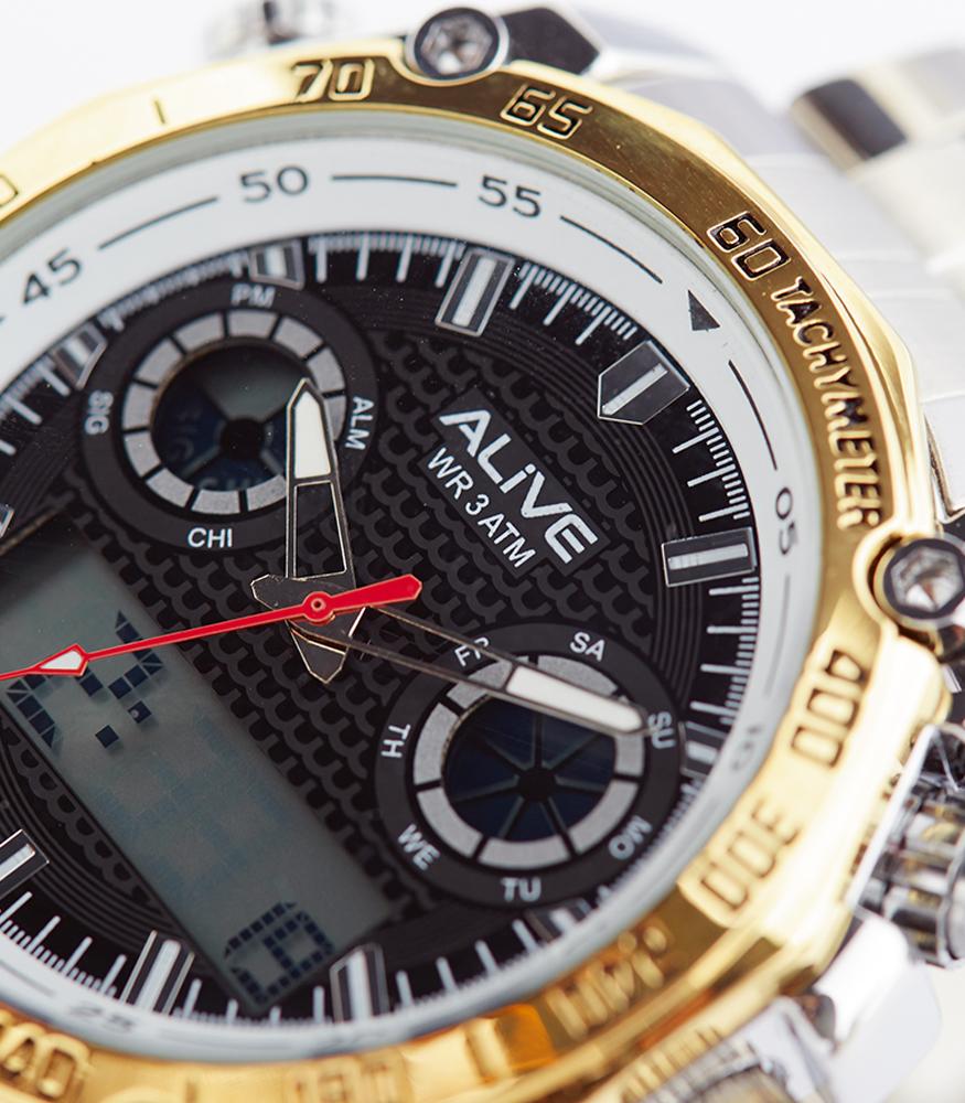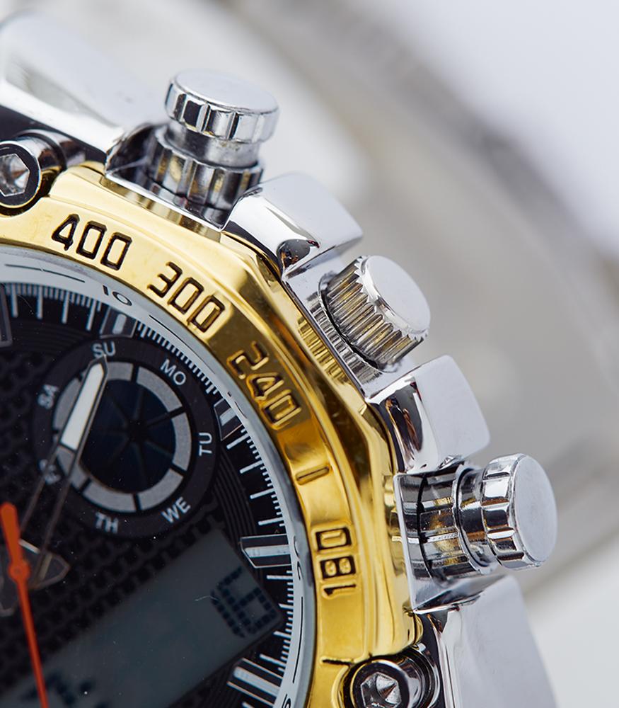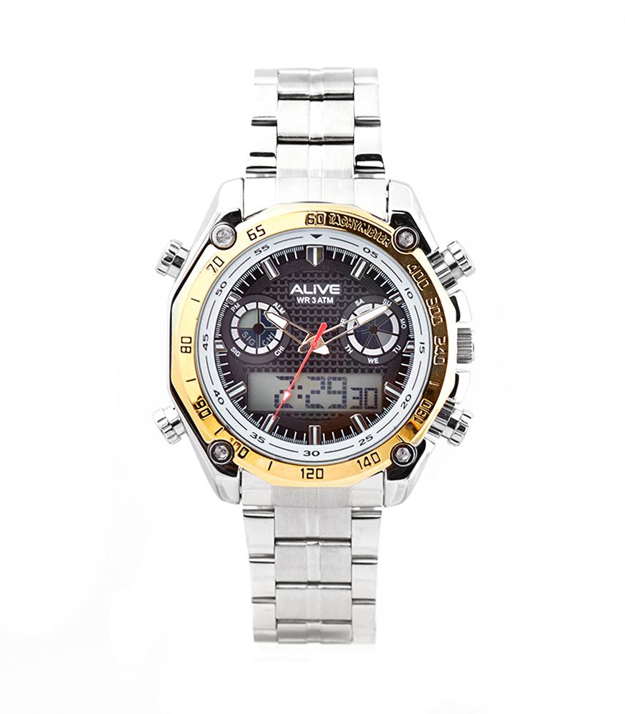 dual movement, analog and digital men watch which has stopwatch function, lights, alarm, calendar, and stainless steel strap, water resistant 3 ATM