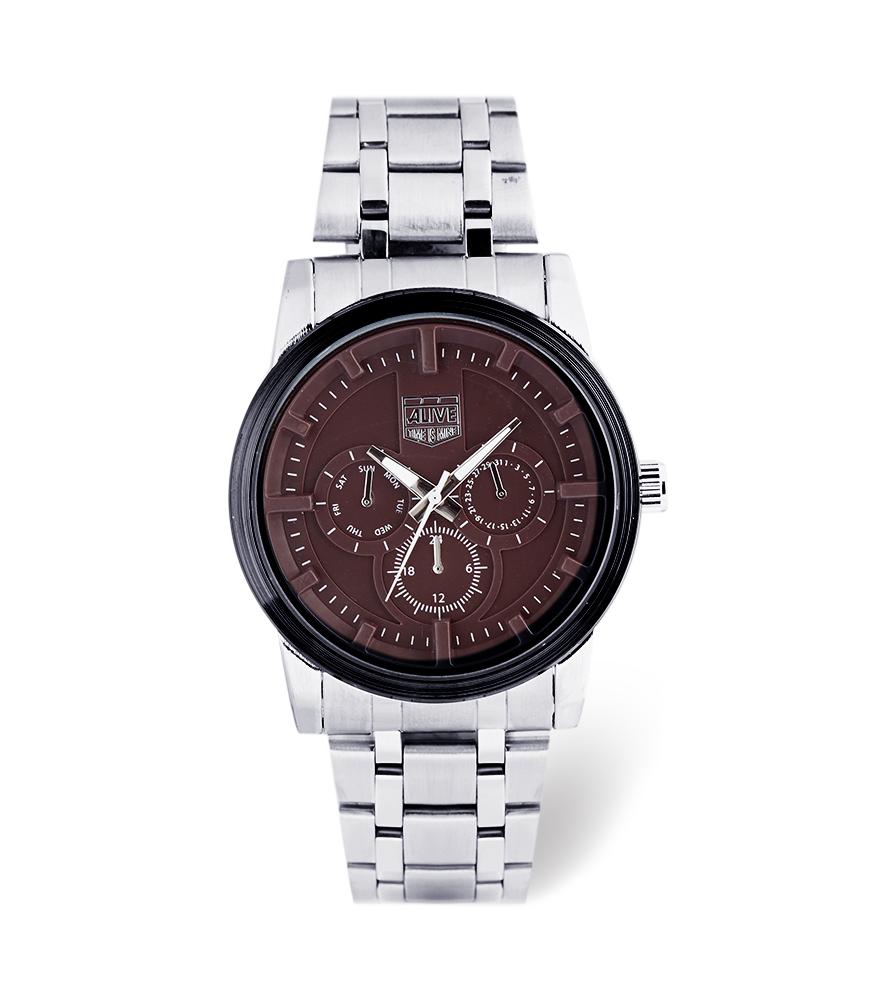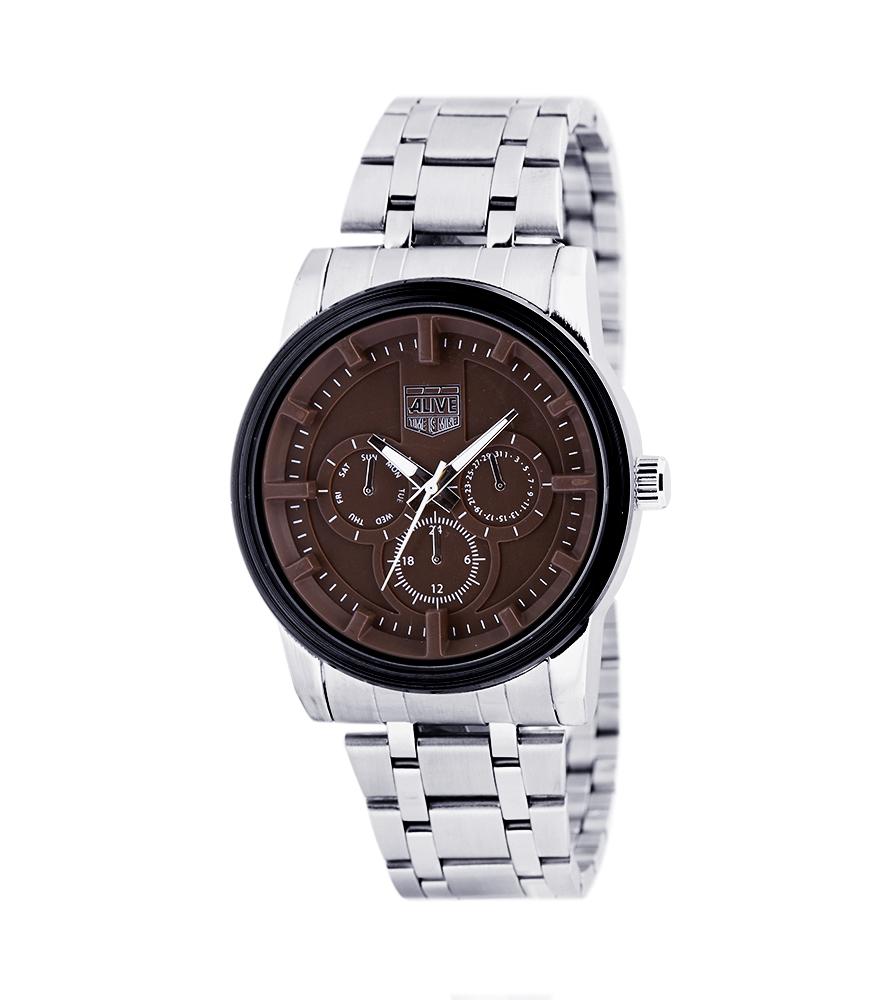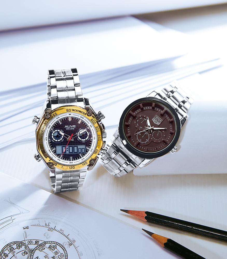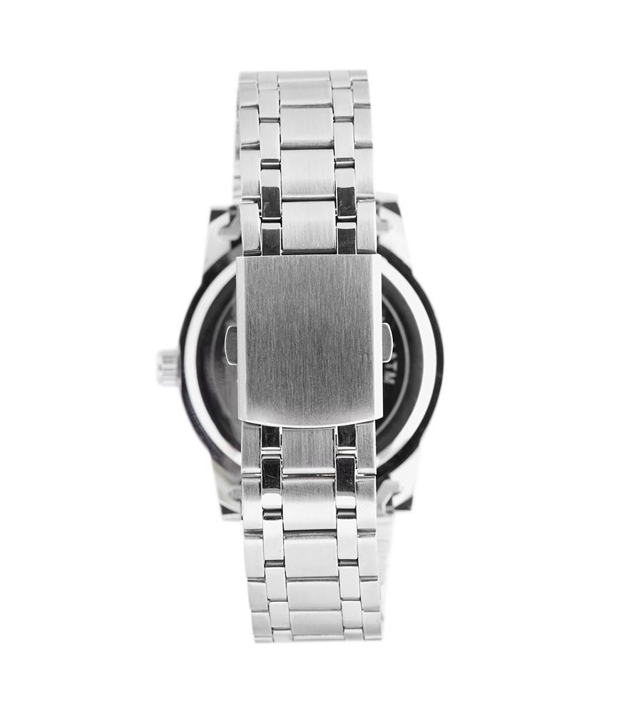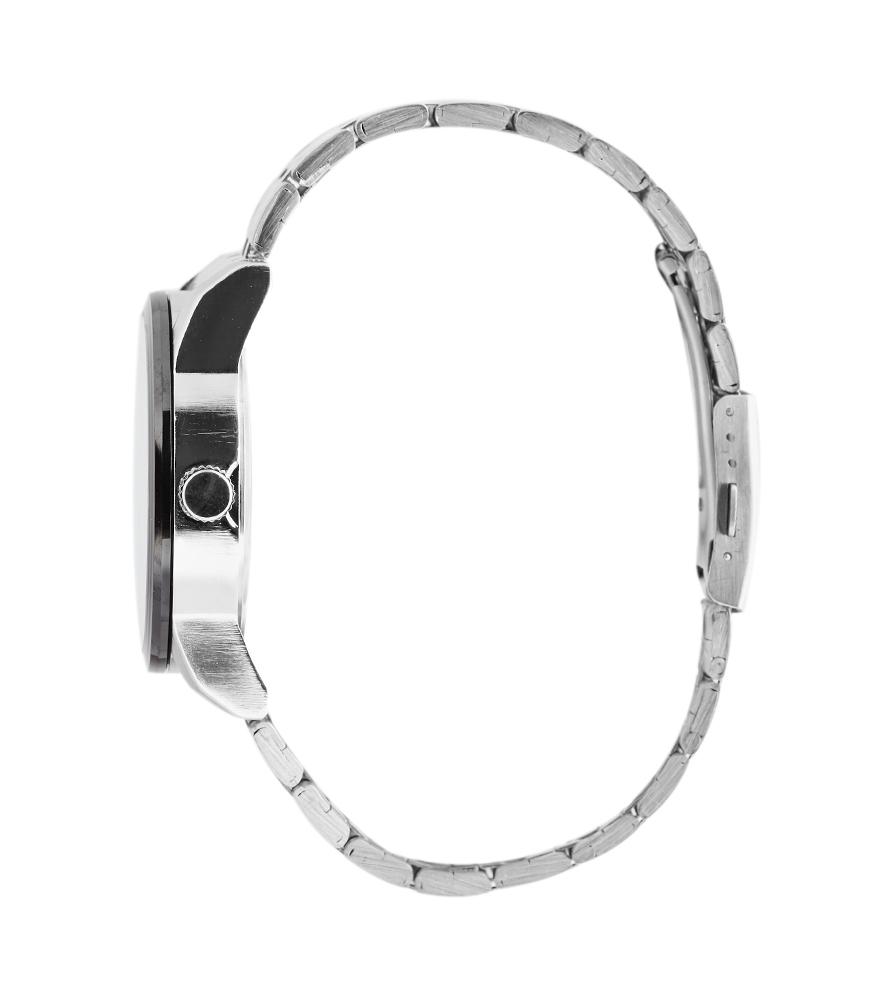 Multi-purpose man watch with day, date, and hour clocks with 24 hour format, and silver stainless steel strap