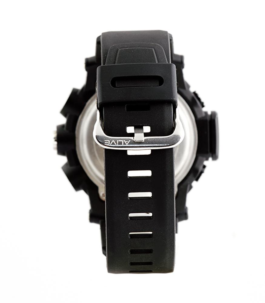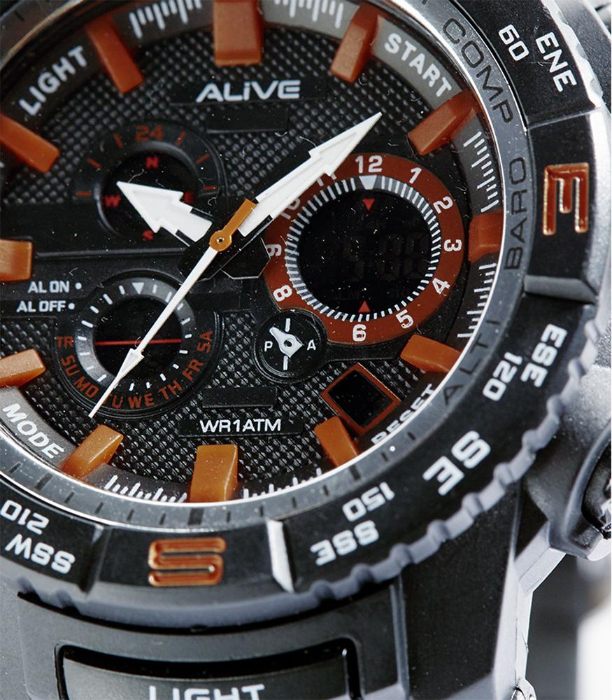 dual movement, analog and digital men watch which has stopwatch function, lamp, alarm, calendar, and rubber water resistant strap 1 ATM