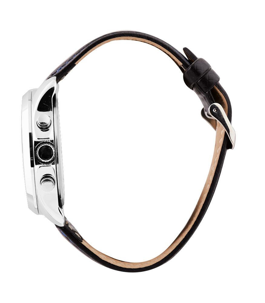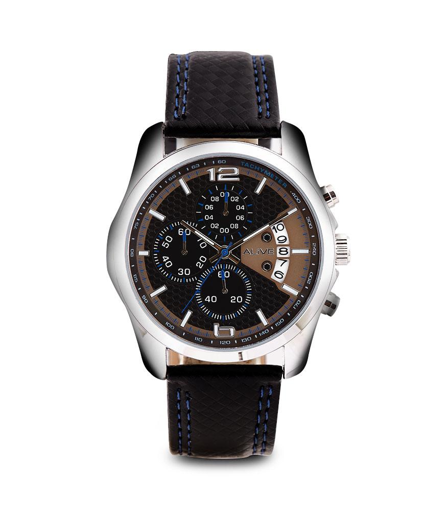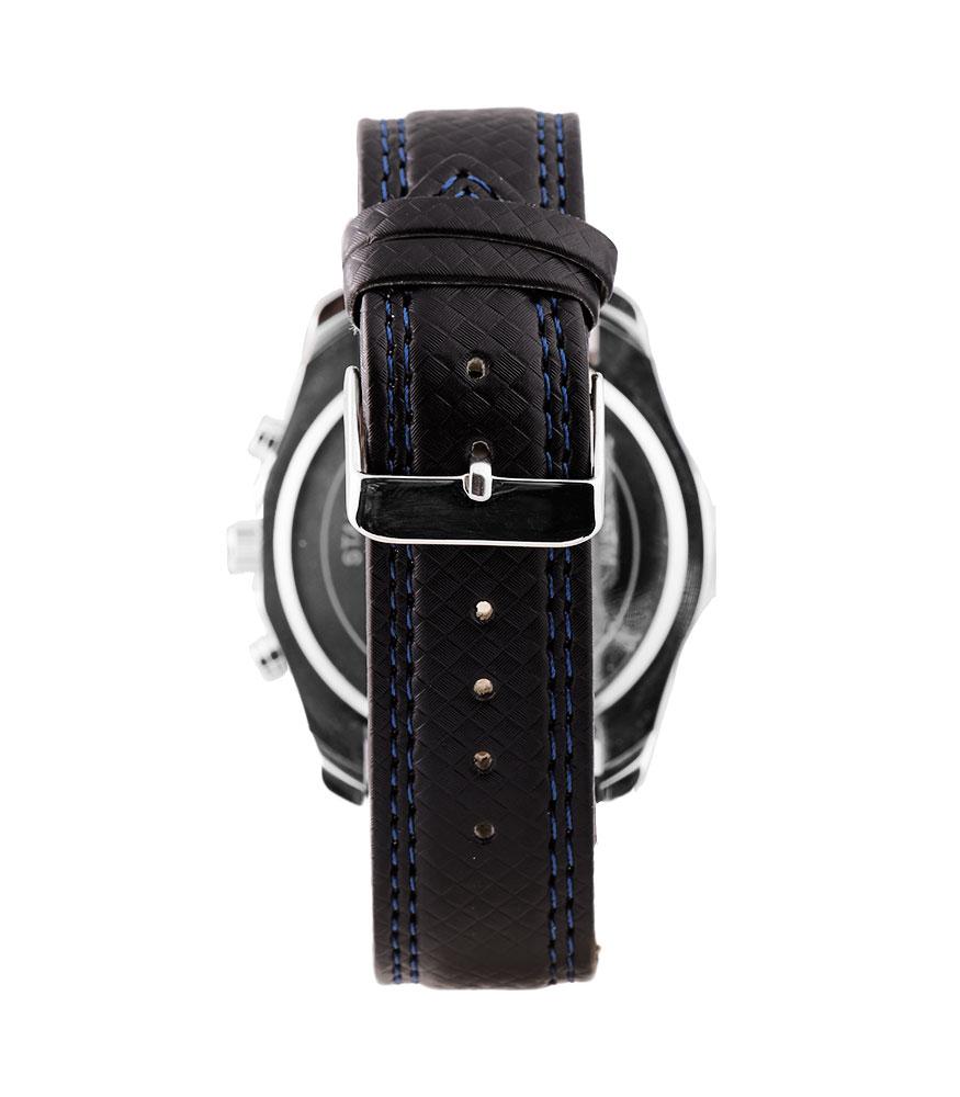a mans watch with a black PU strap and has a stopwatch function and a date bookmark and a water resistant 1 ATM