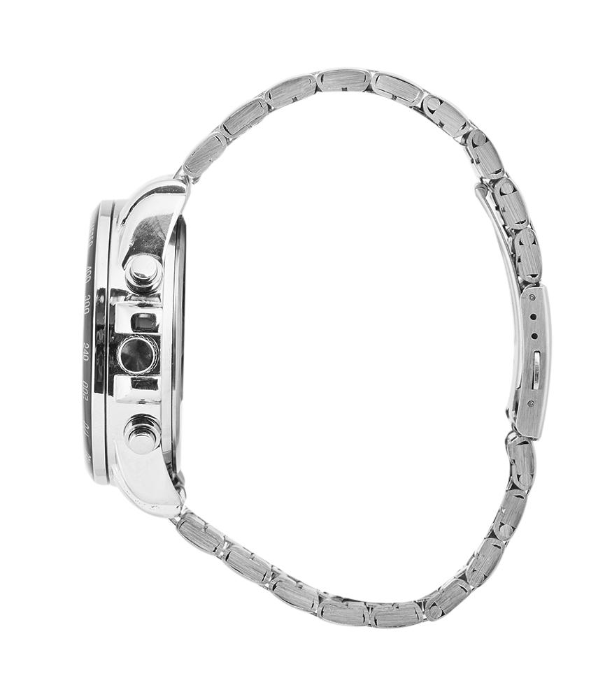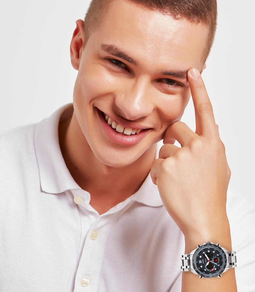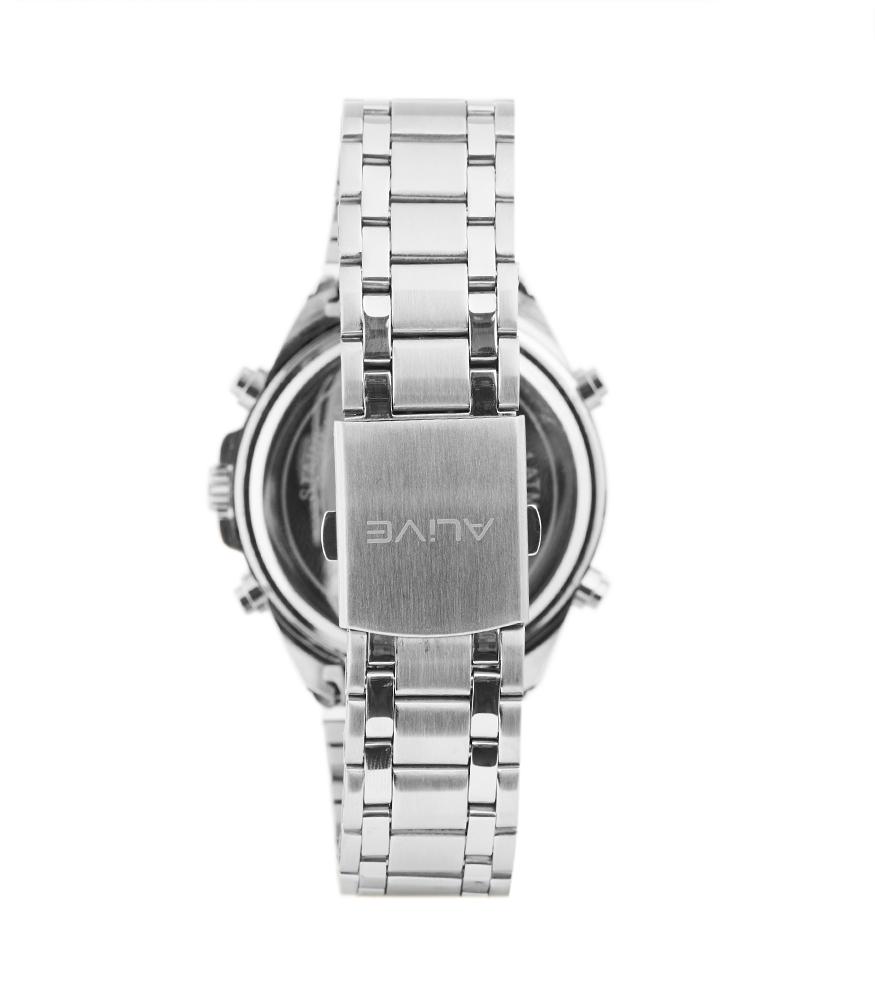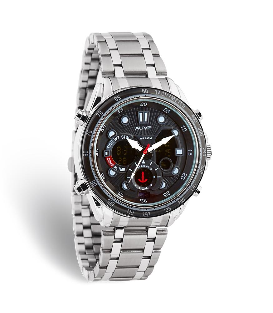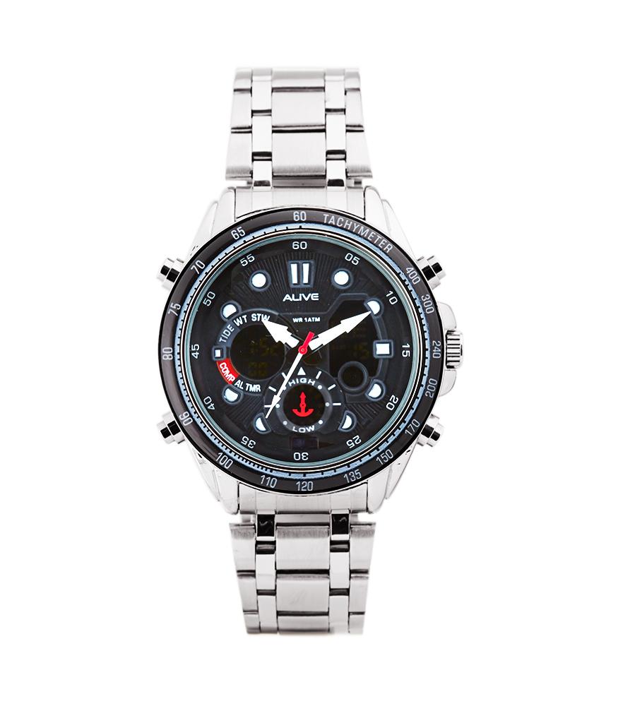 Mens dual movement watches, digital and analogue, with silver stainless steel strap and there are functional alarm, alarm, calendar, lamp and water resistant 1 ATM