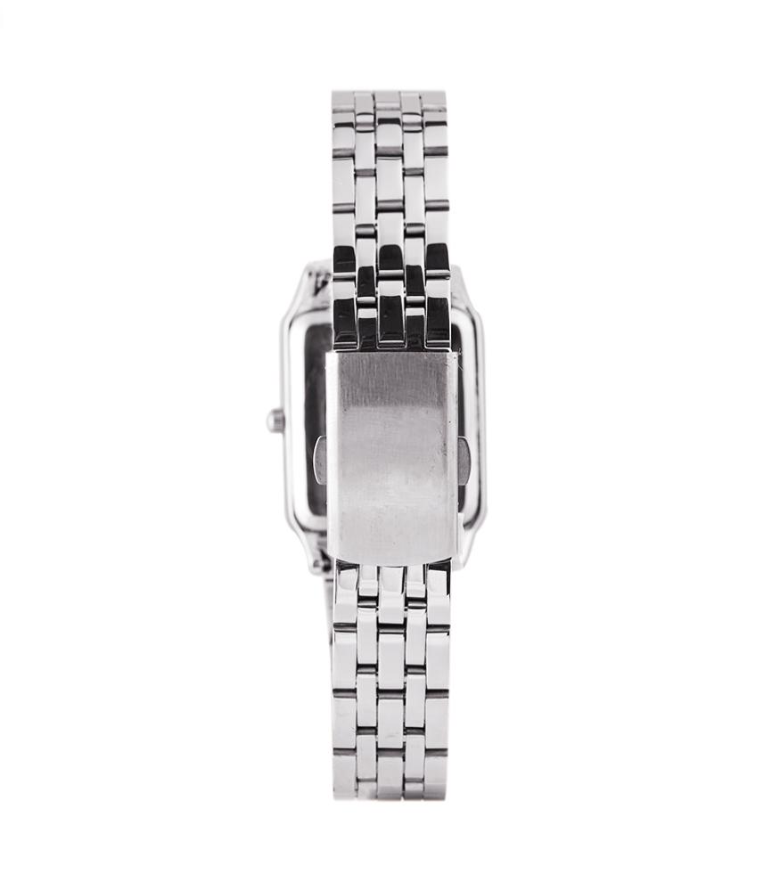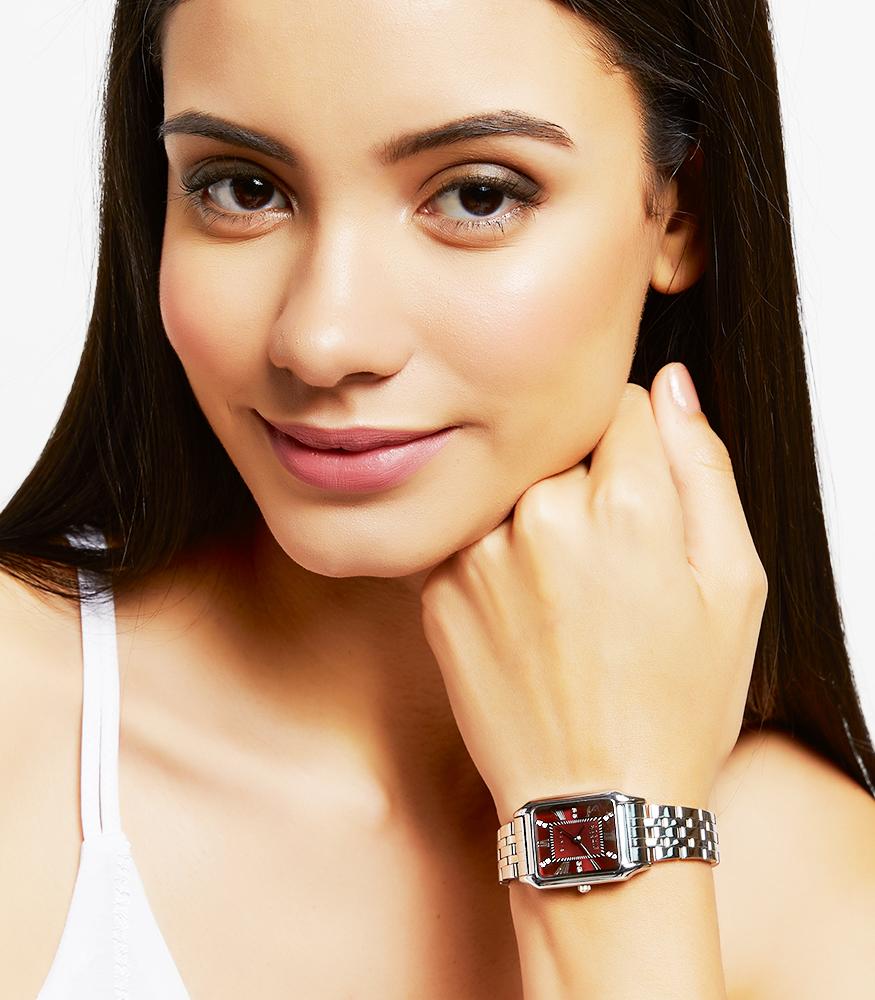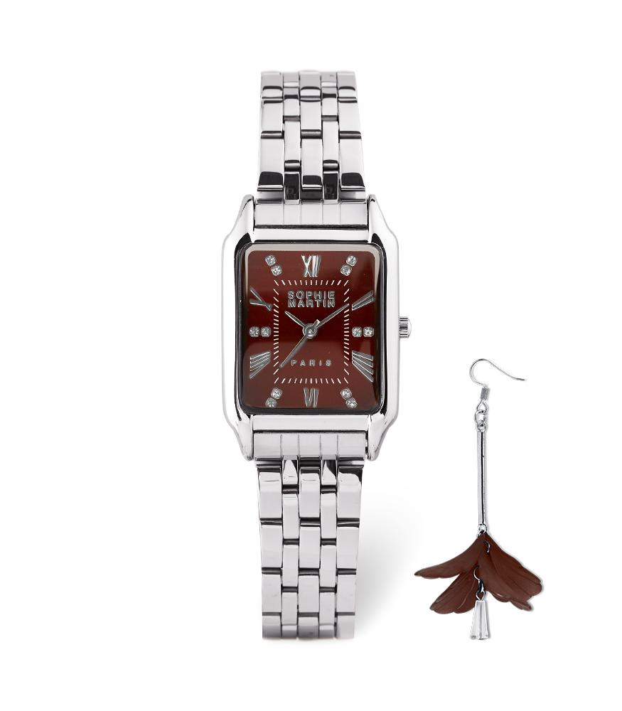 a womans wristwatch with silver stainless steel strap and a classic rectangular casing with a pair of flower earrings as a gift
