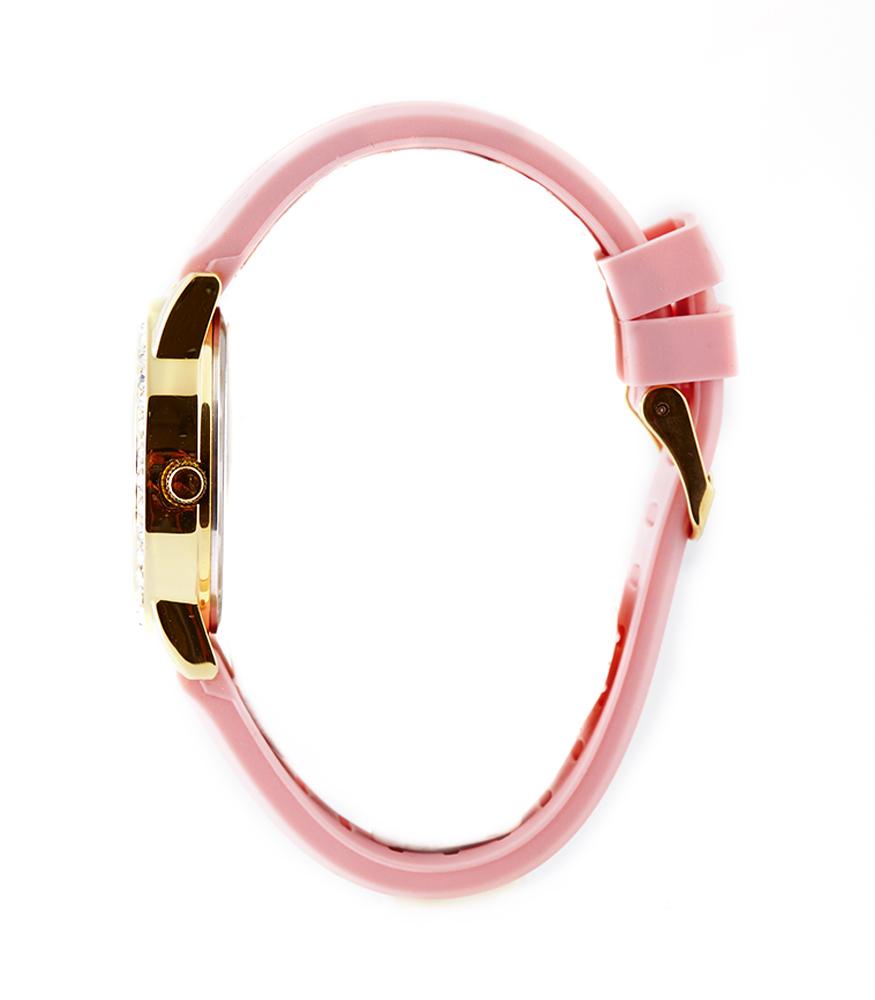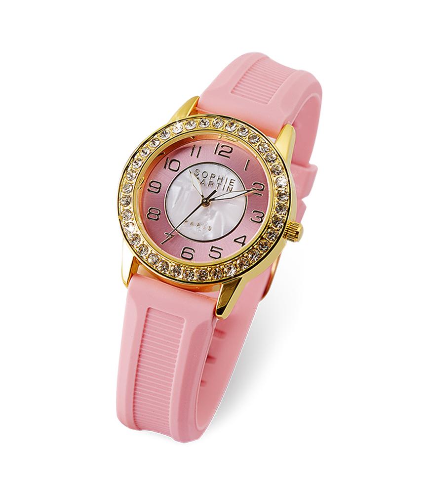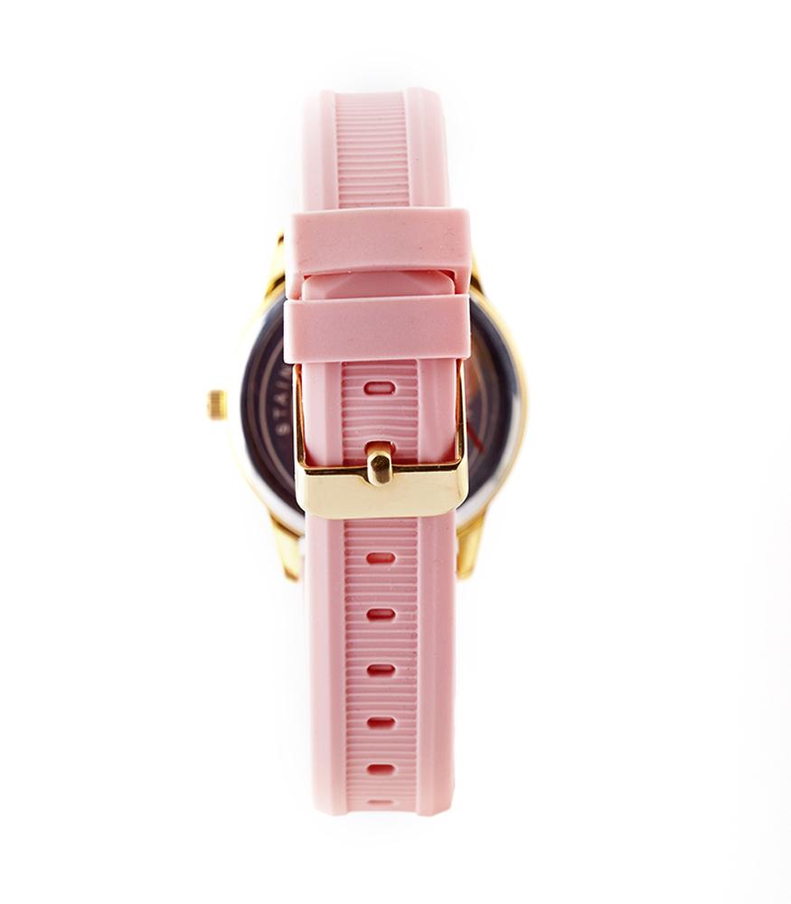 women watch with straps made of pink rubber and pearl combination dial