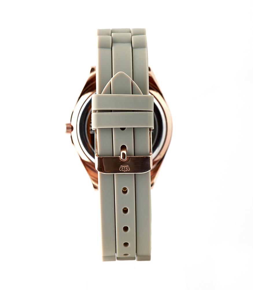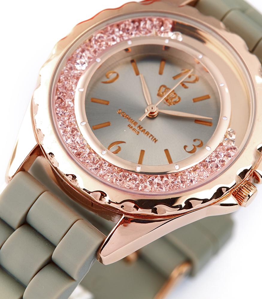 a woman's wristwatch with a rubber strap is gray, and there are stones that can move around the casing