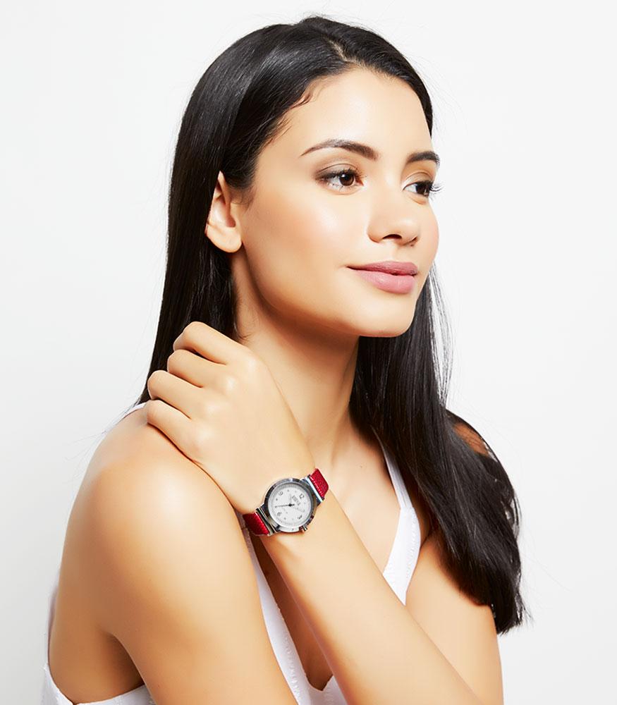 Women watch with a unique strap that has 2 different sides of the color of cream and red that can be changed as desired